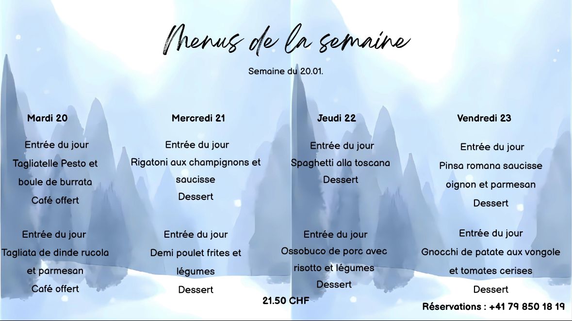 À midi, deux menus au choix vous sont proposés, composés d’une entrée, d’un plat et d’un dessert, inspirés des saveurs de l’Italie, au prix de 21.50 CHF.